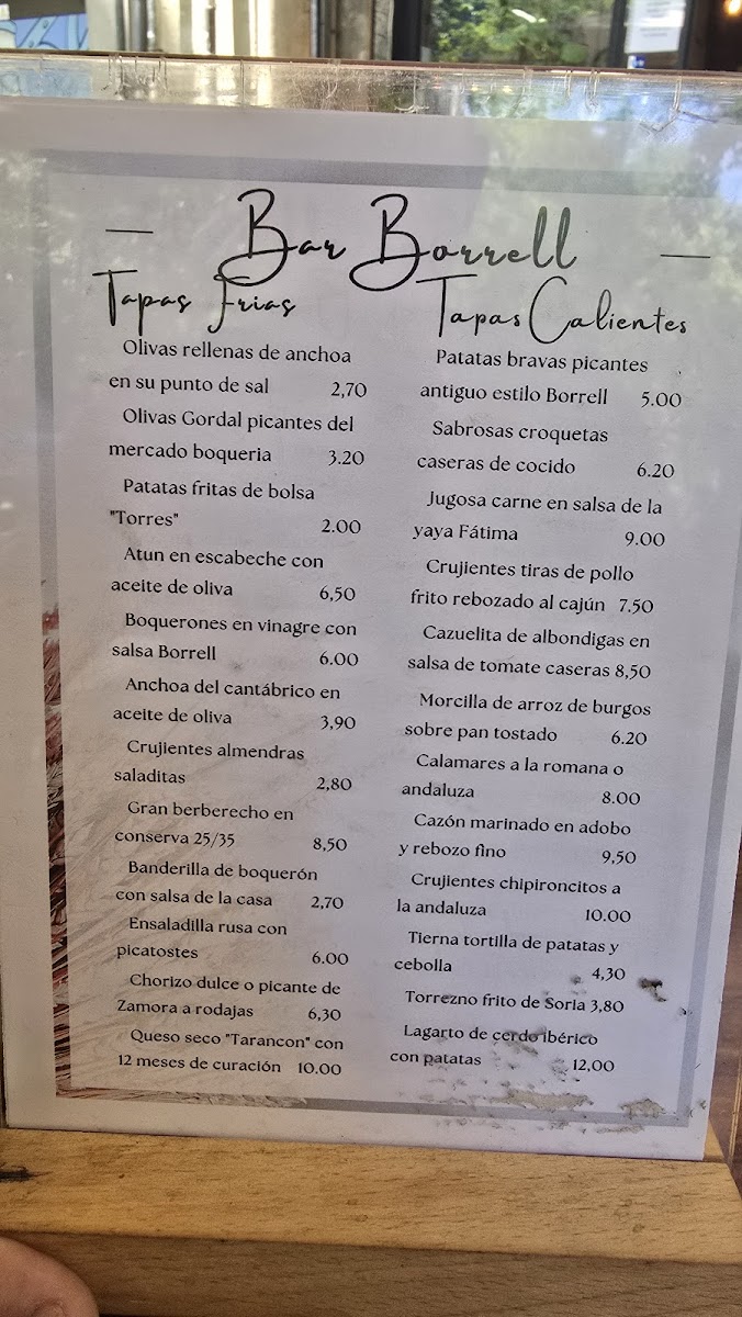 The menu at Bar Borrell offers a straightforward and inviting selection of classic Spanish bar fare, focusing on simple yet satisfying dishes and refreshing drinks. It’s the kind of place where casual bites meet comforting flavors, perfect for sharing with friends or enjoying a relaxed moment over a drink.
